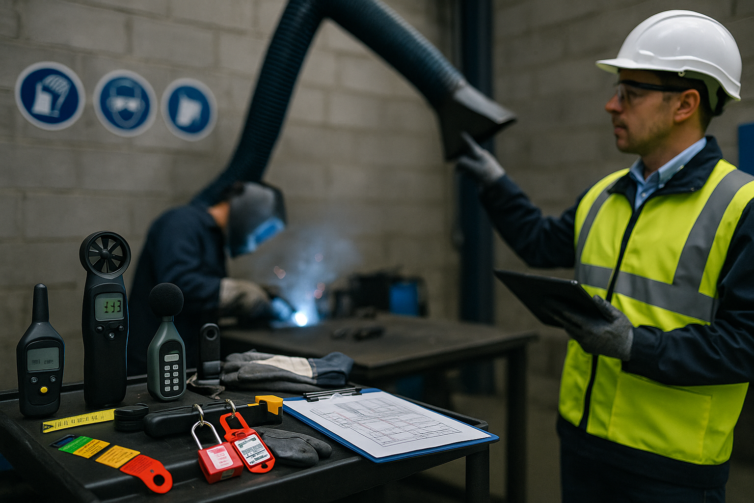 Sprawdzamy wentylację/odciąg dymów, ekranowanie, oświetlenie, oznakowanie i organizację miejsca. Dostajesz prosty raport z rekomendacjami i listą braków zgodny z aktualnymi wymaganiami BHP.